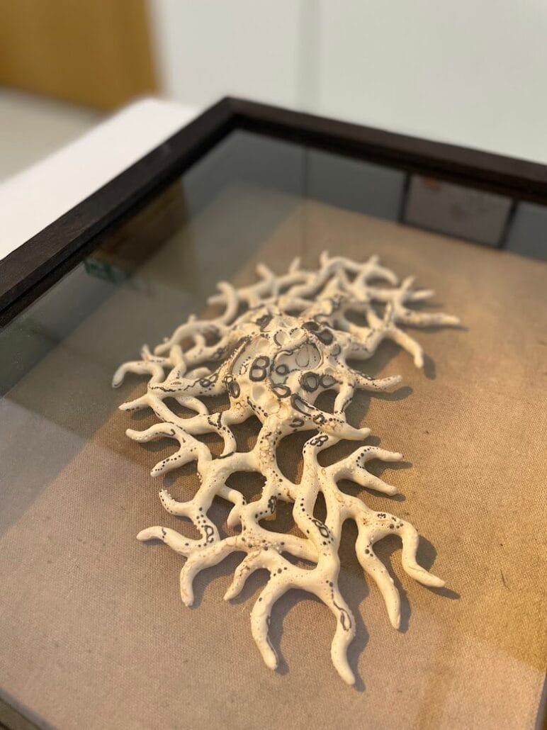 My work examines disconnections between humans and nature in the Anthropocene and society’s artificial constructs that allow us to perceive ourselves as separate from the natural environment. Using clay, organic materials, and mixed media, the work speaks to environmental disasters and expresses our collective fragility in the face of climate change. This piece is inspired by the illustrations of the pioneering Spanish neurologist Santiago Ramon y Cajal (b.1852). I draw conceptual inspiration from his drawings of damaged cells and the retinal neural network to create work that addresses climate change and the role of cognitive dissonance in its perpetuation. This piece is modeled after an astrocyte, a glial cell of the brain and spinal column. These cells are a meaningful symbol in my work due to their incredible ability to repair, regulate, balance, and nourish other cells in the body. In my work, which often features damaged and malformed neurons, astrocytes represent reparative resilience amid an impending crisis. The extreme fragility of these forms conceptually links the work to our precarious position in time. The work is successful when viewers come away with a heightened sense of the precipice upon which we waver. To consider ourselves separate from the biosphere we inhabit is a tenuous fallacy perpetuated by those who stand to profit from this collective delusion.