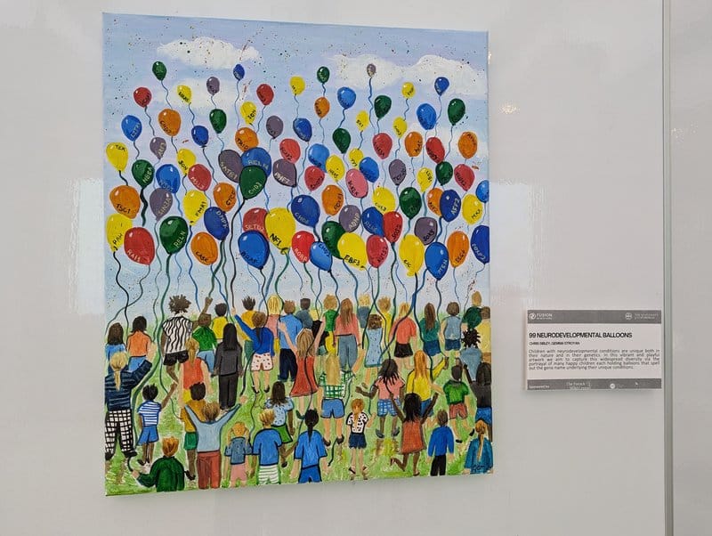 Children with neurodevelopmental conditions are unique both in their nature and in their genetics. In this vibrant and playful artwork we aim to capture this widespread diversity via the portrayal of many happy children each holding balloons that spell out the gene name underlying their unique conditions.