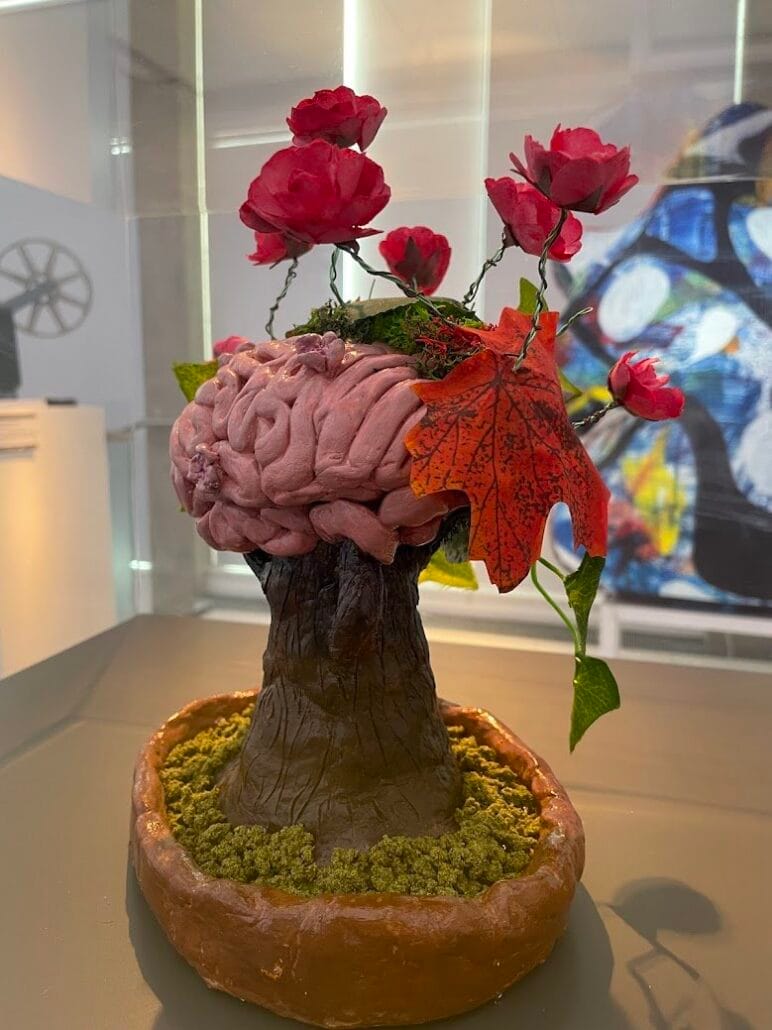 Nature is an ever-evolving entity, growing, flourishing and blooming. Much like trees, the brain develops and blossoms with time. The development of the brain is governed by many processes, including the generation of specific neurons. We have worked with “mini-brains” in the lab, observing their growth and levels of excitatory and inhibitory neurons, which are two major neuronal classes. We specifically looked at an autism-implicated mutation and how that impacts brain development. To encapsulate our laboratory work and the beautiful symmetry the brain has with trees, we moulded air-drying clay into a cherry blossom bonsai with a brain-like structure as the leafy bulk of the tree. On one side, we displayed green and red foliage to represent the excitatory (green) and inhibitory (red) neurons in our “mini-brains”, that we analysed in microscopy. Although nothing to do with our laboratory work or with the developing brain, we also added a squirrel. Can you spot her?