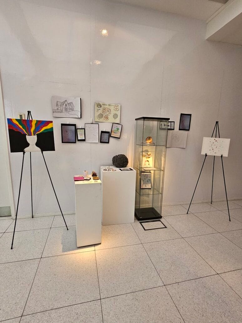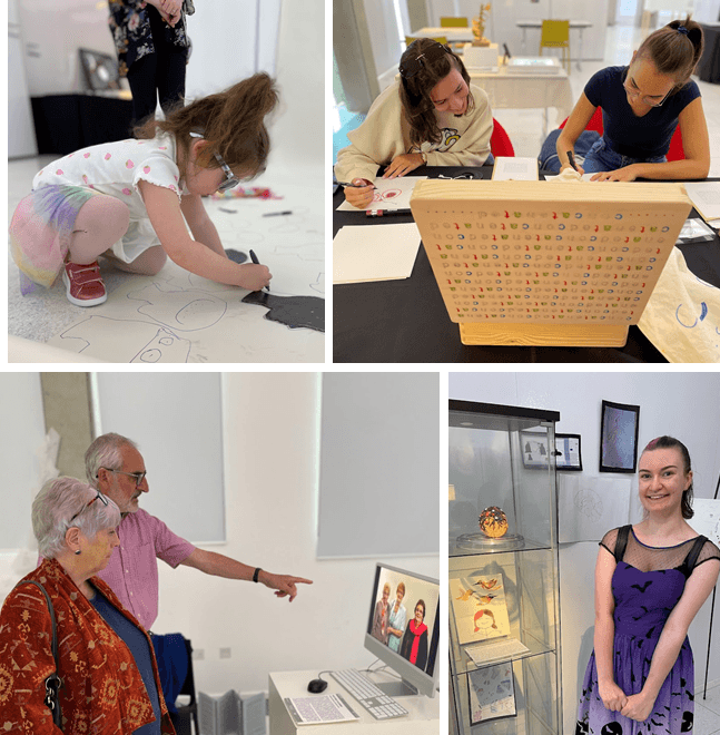 We had an incredible opening night, of around 70 attendants – a full house at Inspace Gallery, Edinburgh. We had introductory talks from Gintarė Bagačionkaitė (Fusion) and Jane Wright (SIDB). These were followed by Dr Tom Pratt (SIDB Group Leader and Fusion member) who introduced the ‘My life’ project, where art pieces have been created by the families who work with the Patrick Wild Centre, and art is inspired by life with a genetic condition.