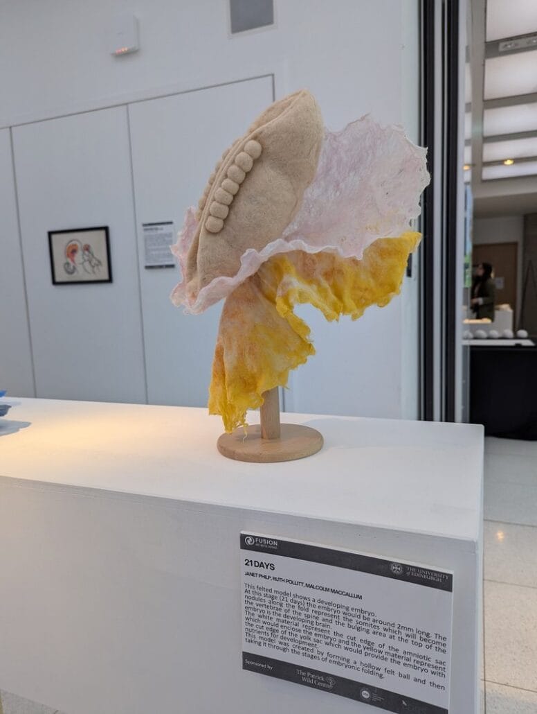 This felted model shows a developing embryo. At this stage (21 days) the embryo would be around 2mm long. The nodules along the fold represent the somites which will become the vertebrae of the spine and the bulging area at the top of the embryo is the developing brain.