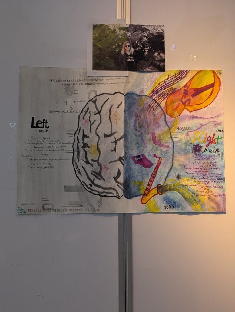 For a long time it was thought that people can be left or right-brained. While that is now a debunked myth as everyone’s brain works as a whole, the idea that the left side of the brain is the logical/analytical and the right side is the creative/emotional does have some truth to it, although it has also been shown that some functions typically belonging to one side of the brain might happen on the other side. With this interactive watercolour and 35mm film piece we intend to artistically shed light into a scientific topic, providing facts visually to speak up about science facts wrongly transformed through the mainstream. The watercolour section initially provides the basic left-brain and right-brain sections, eachwith their typical functions. However, some functions that were discovered to be in the opposite brain side of the one you would initially think (e.g., understanding numbers that contain zeros) have been added. Finally, the 35mm film photographs bring a more ‘humane’ side, as we’re not ‘just’ our brains, but there’s a person for each one, showing brain lateralization in black and white vs. colour, playing with saturation and contrast.