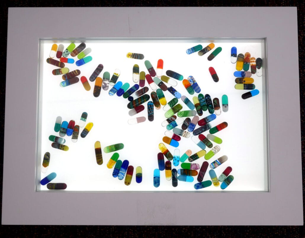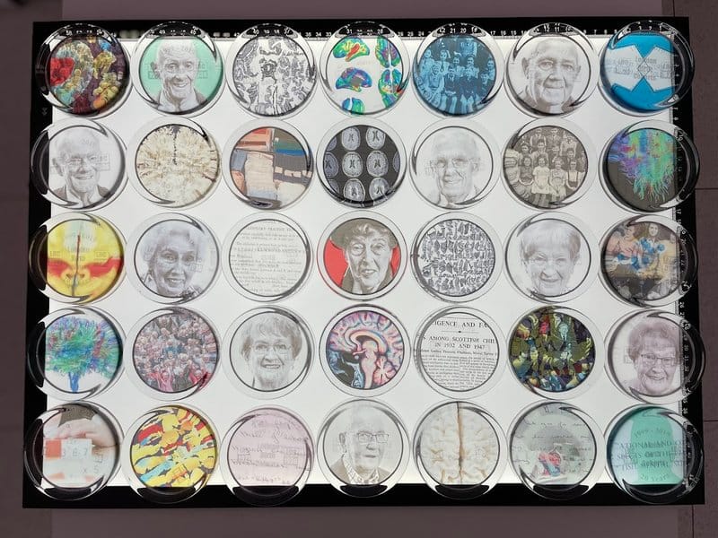 In 2019, glass paperweights were created as gifts to celebrate the twentieth anniversary of the Lothian Birth Cohorts. Most were given away, but those that remain have been used in the creation of this artwork that references the LBC archives and celebrates this important study.