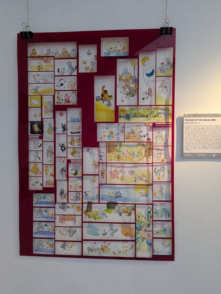 We are enchanted by the Developing Brain’s ability to support our everyday social behaviours. To explore the brain’s role in kinship behaviour, Zuzanna uses small rectangular building pieces to create a maze or her experiment. After the maze is built, she’s left with a large sheet of red acrylic, filled with holes where the pieces were laser-cut. We decided to use this peculiar “frame” to frame various familial social interactions, bridging the scientific tool used to investigate kinship with an artist’s vision of what kinship looks like. Kelly filled this frame with drawings depicting everyday social interactions between family members and friends. In other words, just as animals navigate the maze in Zuzanna’s experiment, the brain navigates the maze of social situations in Kelly’s drawings. The behaviours are portrayed using cat characters, representing everyone in a humorous, inclusive, and joyful way
