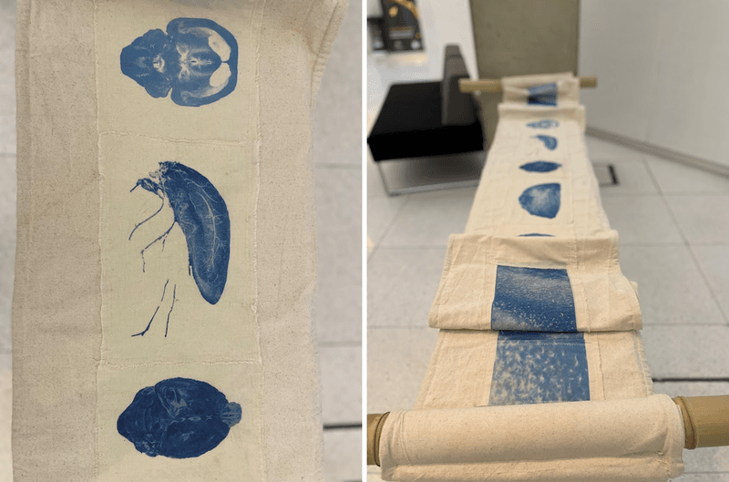 The work uses the form of the scroll, one of the most ancient forms of recording information. It references the Japanese “emaki” form in which the images can be unfurled and viewed individually or sequentially but can also be displayed as a hanging, or more sculpturally draped to evoke the folding of brain structures.